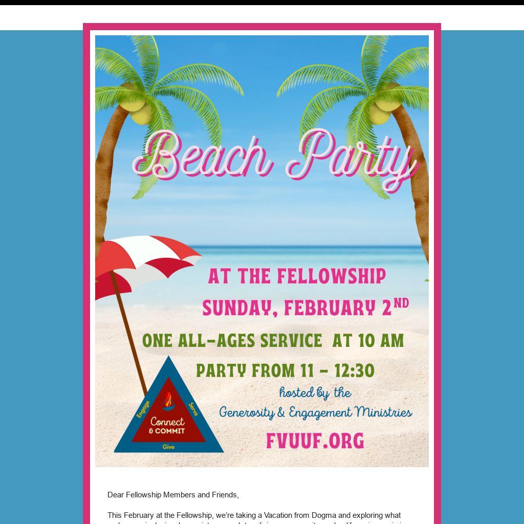 Plan to dress in your beachy best and celebrate with one all-ages service on Sunday, February 2nd. We will explore the gifts of humanism at 10:00 am followed by a Beach Party from 11:00 am -12:30 pm sure to shake off those mid-winter blues! At the party, we’ll have games, activities, snacks, and fun for all ages, and we can’t wait to see you there!