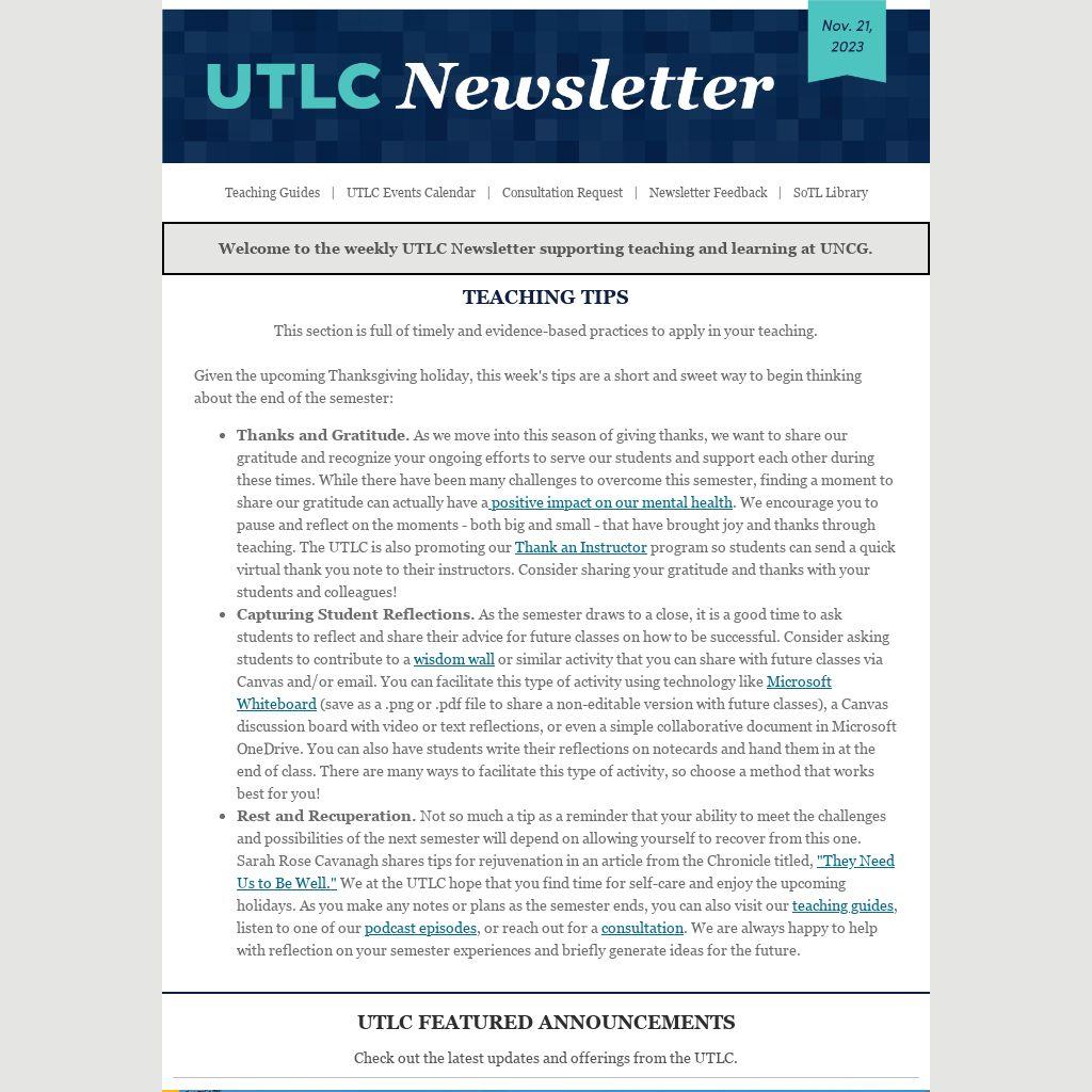 Welcome to the weekly UTLC Newsletter supporting teaching and learning at UNCG.