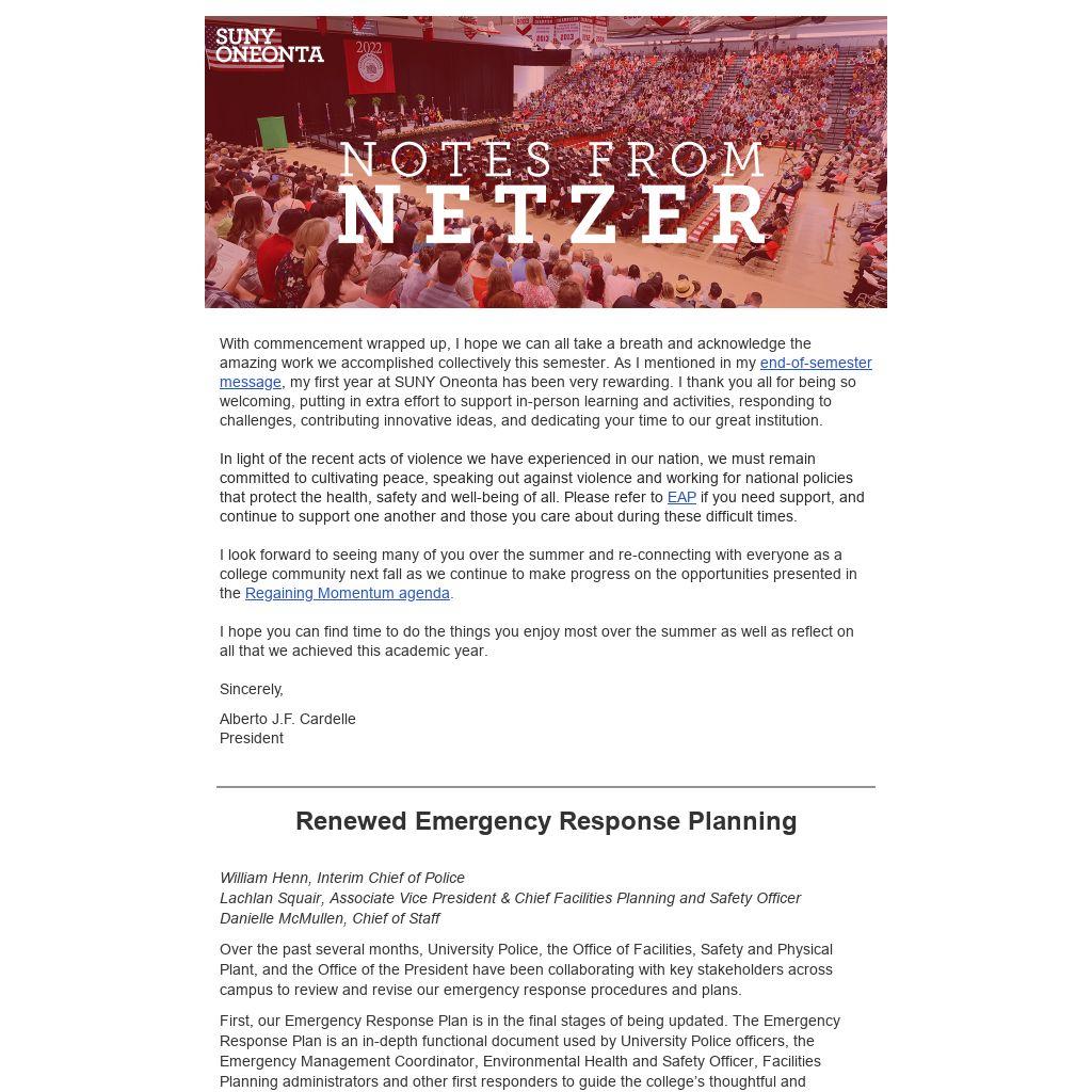 | With commencement wrapped up, I hope we can all take a breath and acknowledge the amazing work we accomplished collectively this semester. As I mentioned in my end-of-semester message, my first year at SUNY Oneonta has been very rewarding. I thank you all for being so welcoming, putting in extra effort to support in-person learning and activities, responding to challenges, contributing innovative ideas, and dedicating your time to our great institution.
