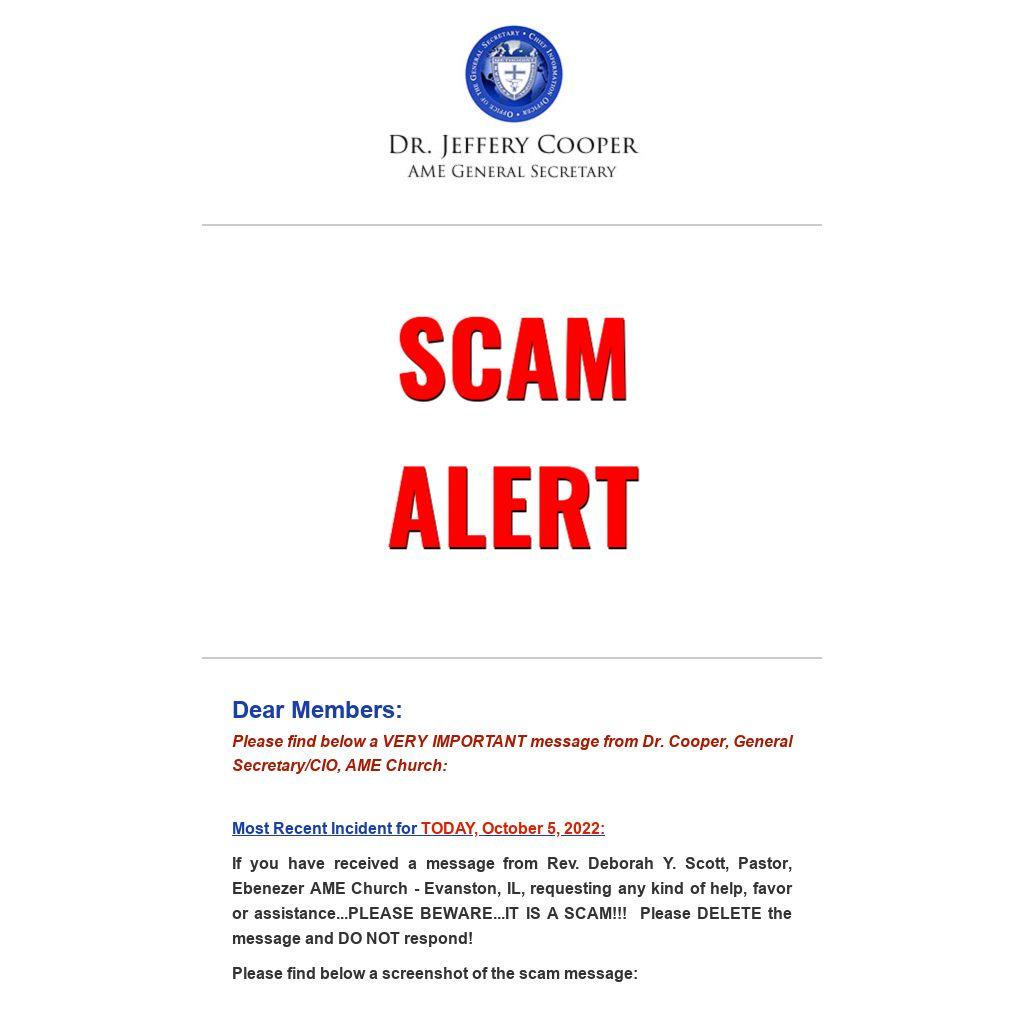 If you have received a message from Rev. Deborah Y. Scott, Pastor, Ebenezer AME Church - Evanston, IL, requesting any kind of help, favor or assistance...PLEASE BEWARE...IT IS A SCAM!!! Please DELETE the message and DO NOT respond!