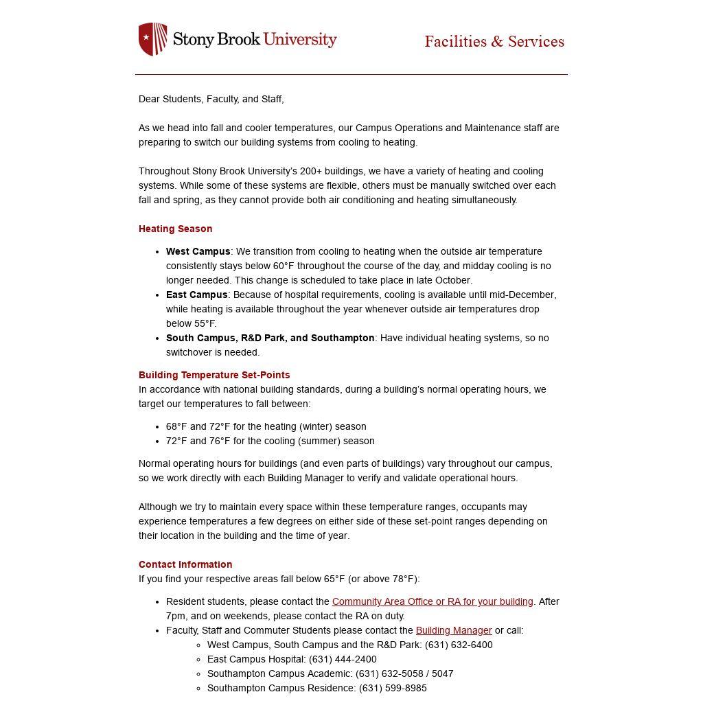 Throughout Stony Brook University’s 200+ buildings, we have a variety of heating and cooling systems. While some of these systems are flexible, others must be manually switched over each fall and spring, as they cannot provide both air conditioning and heating simultaneously.