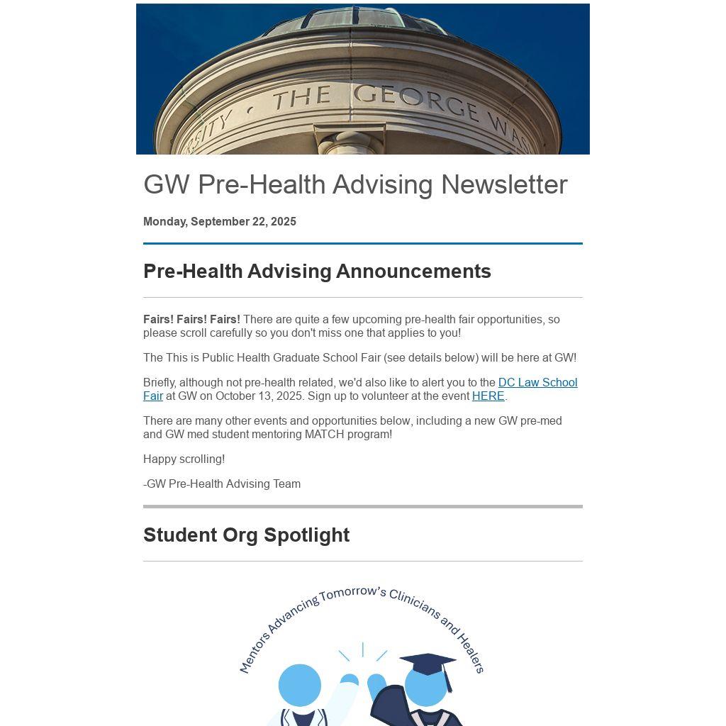 Briefly, although not pre-health related, we'd also like to alert you to the DC Law School Fair at GW on October 13, 2025. Sign up to volunteer at the event HERE.