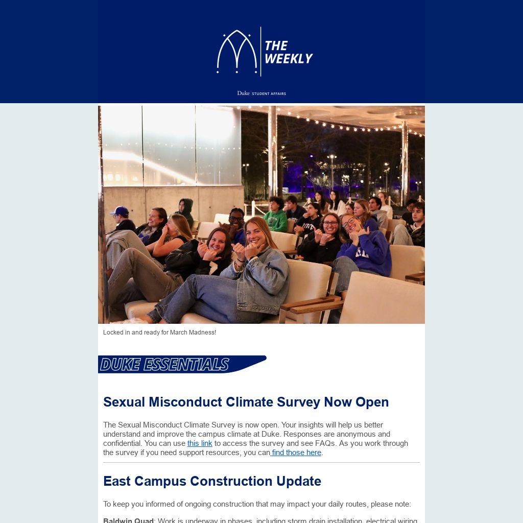 The Sexual Misconduct Climate Survey is now open. Your insights will help us better understand and improve the campus climate at Duke. Responses are anonymous and confidential. You can use this link to access the survey and see FAQs. As you work through the survey if you need support resources, you can find those here.