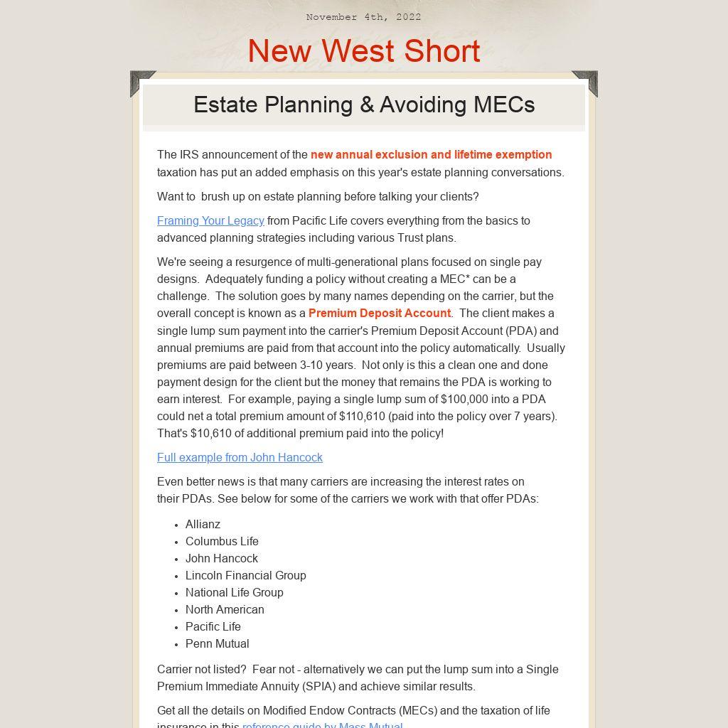 We're seeing a resurgence of multi-generational plans focused on single pay designs. Adequately funding a policy without creating a MEC* can be a challenge. The solution goes by many names depending on the carrier, but the overall concept is known as a Premium Deposit Account. The client makes a single lump sum payment into the carrier's Premium Deposit Account (PDA) and annual premiums are paid from that account into the policy automatically. Usually premiums are paid between 3-10 years. Not only is this a clean one and done payment design for the client but the money that remains the PDA is working to earn interest. For example, paying a single lump sum of $100,000 into a PDA could net a total premium amount of $110,610 (paid into the policy over 7 years). That's $10,610 of additional premium paid into the policy!