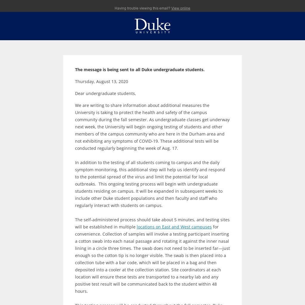 We are writing to share information about additional measures the University is taking to protect the health and safety of the campus community during the fall semester. As undergraduate classes get underway next week, the University will begin ongoing testing of students and other members of the campus community who are here in the Durham area and not exhibiting any symptoms of COVID-19. These additional tests will be conducted regularly beginning the week of Aug. 17.