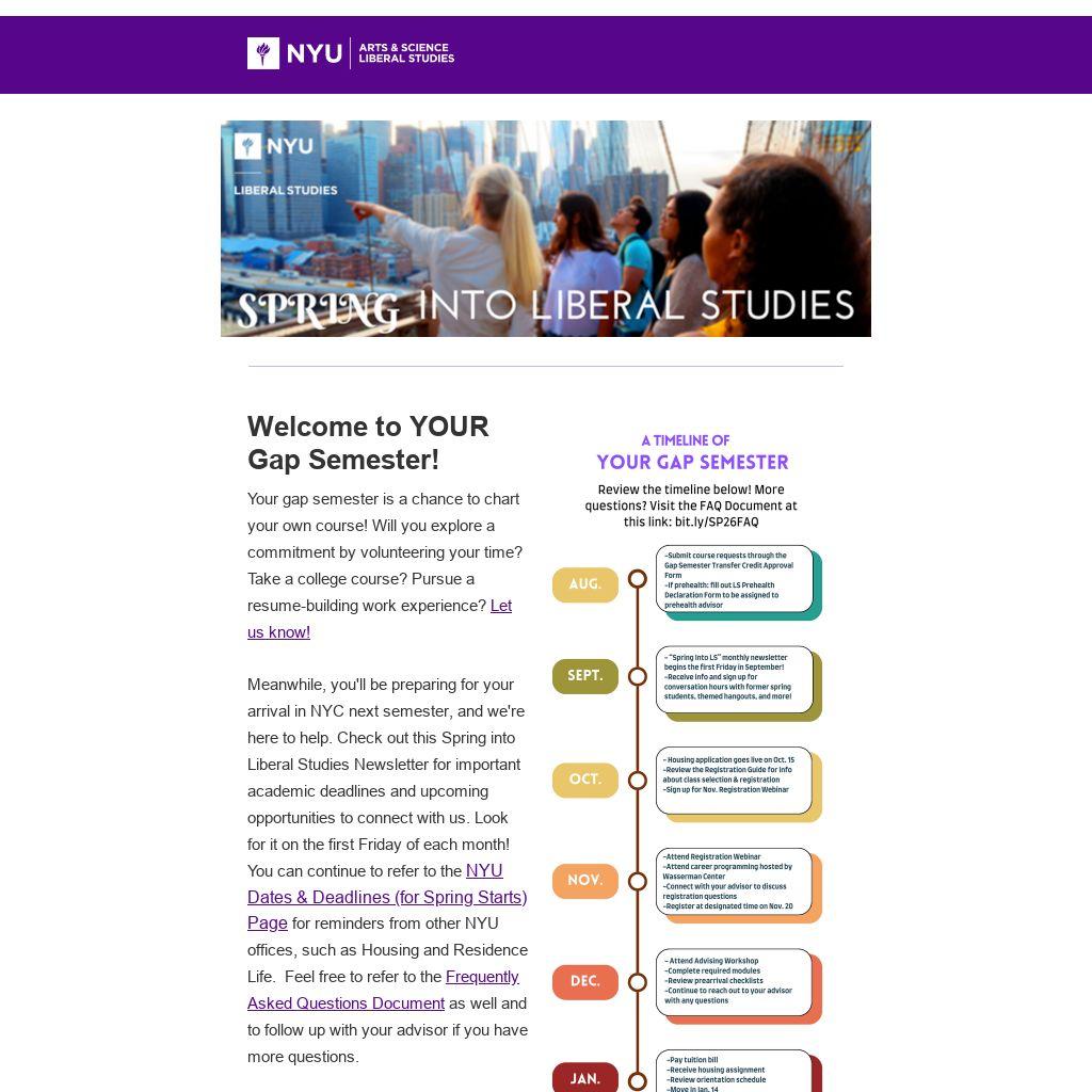 Meanwhile, you'll be preparing for your arrival in NYC next semester, and we're here to help. Check out this Spring into Liberal Studies Newsletter for important academic deadlines and upcoming opportunities to connect with us. Look for it on the first Friday of each month! You can continue to refer to the NYU Dates & Deadlines (for Spring Starts) Page for reminders from other NYU offices, such as Housing and Residence Life. Feel free to refer to the Frequently Asked Questions Document as well and to follow up with your advisor if you have more questions.