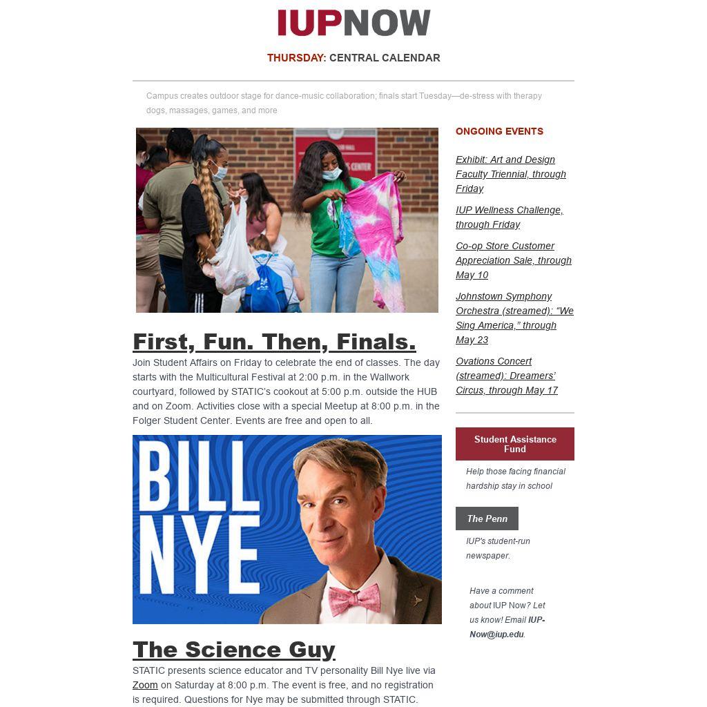 Distributed to IUP employees and students four days a week, IUP Now is the official newsletter of Indiana University of Pennsylvania. It features news from across the IUP website, compiled by the Division of Marketing and Communications. Find out how to get your news and events in IUP Now.