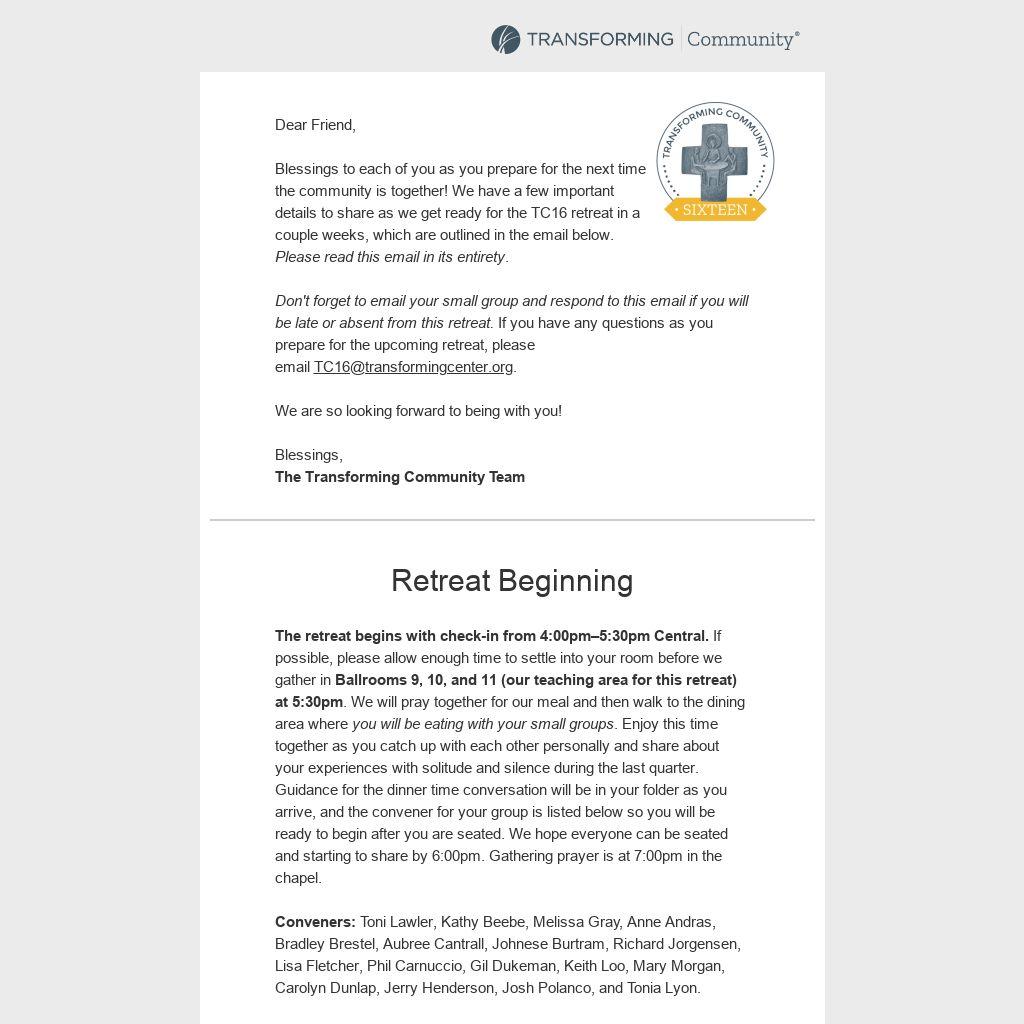 The retreat begins with check-in from 4:00pm–5:30pm Central. If possible, please allow enough time to settle into your room before we gather in Ballrooms 9, 10, and 11 (our teaching area for this retreat) at 5:30pm. We will pray together for our meal and then walk to the dining area where you will be eating with your small groups. Enjoy this time together as you catch up with each other personally and share about your experiences with solitude and silence during the last quarter. Guidance for the dinner time conversation will be in your folder as you arrive, and the convener for your group is listed below so you will be ready to begin after you are seated. We hope everyone can be seated and starting to share by 6:00pm. Gathering prayer is at 7:00pm in the chapel.