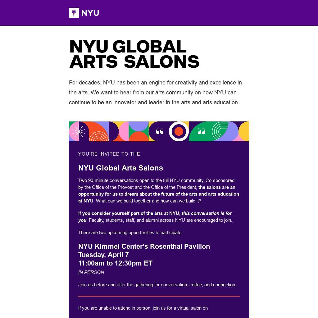 If you consider yourself part of the arts at NYU, this conversation is for you. Faculty, students, staff, and alumni across NYU are encouraged to join.