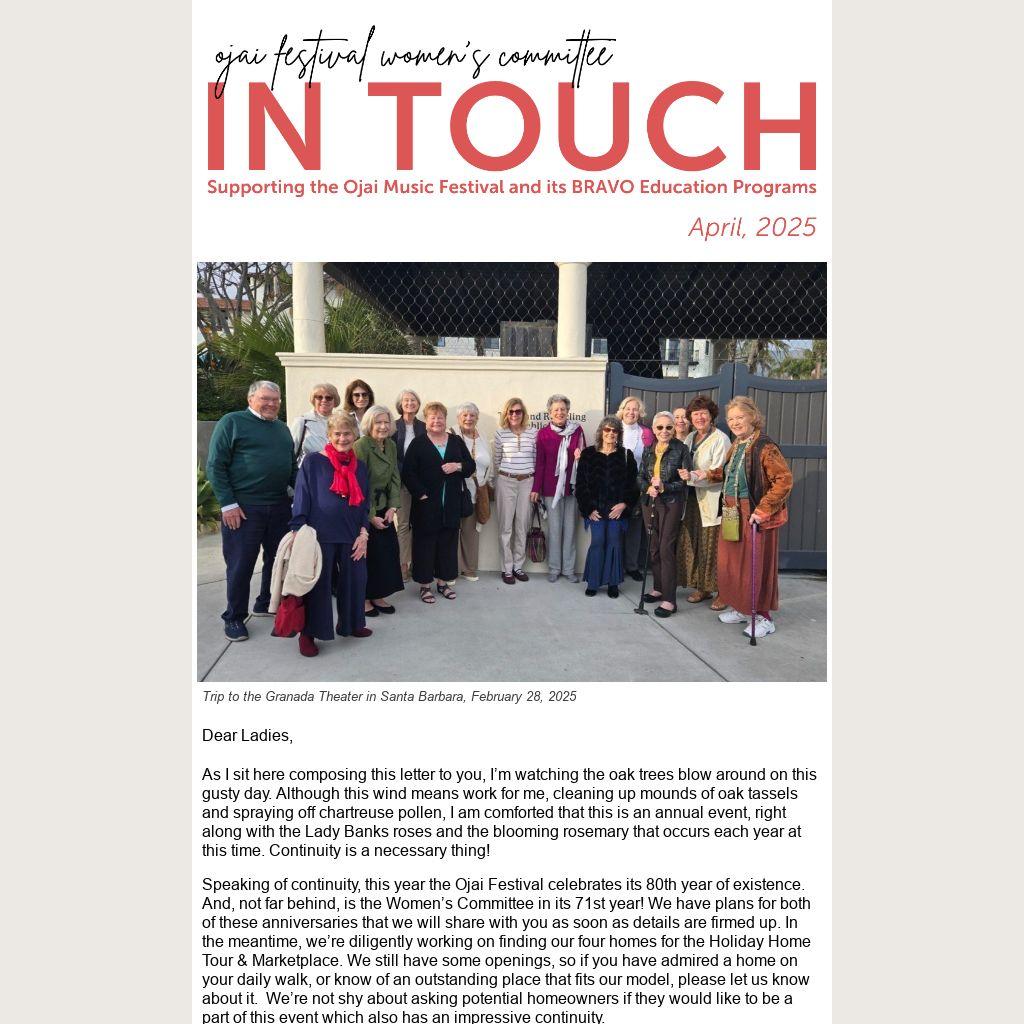 One more thing—this May, we are sending out via email and snail mail your membership renewal form for you to fill out and return. We’ve made it easy to complete either online or if you prefer, filling out on paper and mailing back to us. A very short survey will accompany this form. We sure would appreciate it if you would complete it, as well. This survey will allow us to know what you expect of the Women’s Committee, what you want to do as a member, and how we can foster the continuity of the Ojai Festival Women’s Committee into the future.