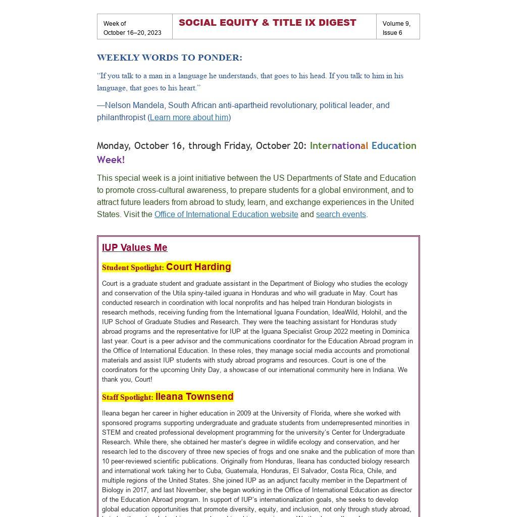 Digest issues are emailed every Monday morning. Send all information concerning your event to social-equity@iup.edu, and we will include it in the appropriate weekly issue. And, please be sure to enter your event in the CMS through the DIVERSITY, STUDENT, and CENTRAL CALENDARS so that it will receive wider marketing and achieve greater attendance.