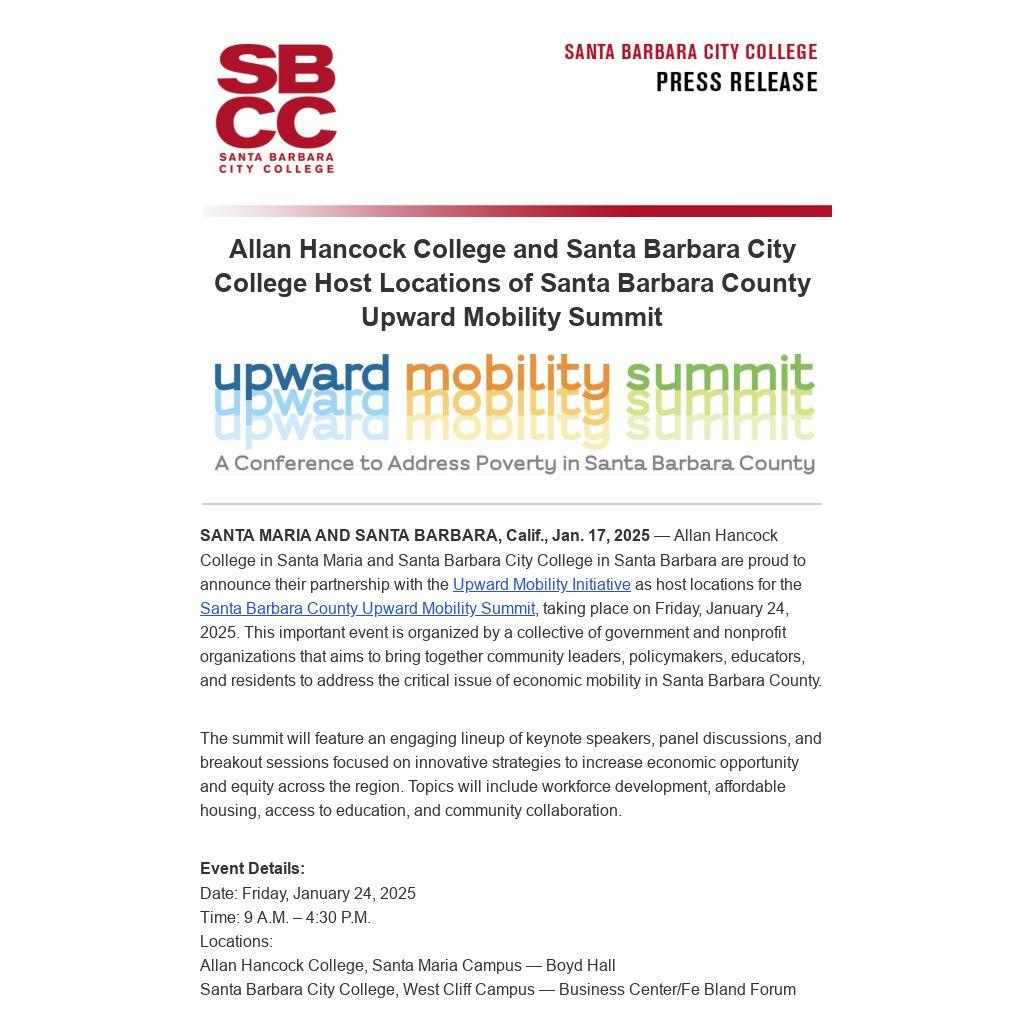 SANTA MARIA AND SANTA BARBARA, Calif., Jan. 17, 2025 — Allan Hancock College in Santa Maria and Santa Barbara City College in Santa Barbara are proud to announce their partnership with the Upward Mobility Initiative as host locations for the Santa Barbara County Upward Mobility Summit, taking place on Friday, January 24, 2025. This important event is organized by a collective of government and nonprofit organizations that aims to bring together community leaders, policymakers, educators, and residents to address the critical issue of economic mobility in Santa Barbara County.