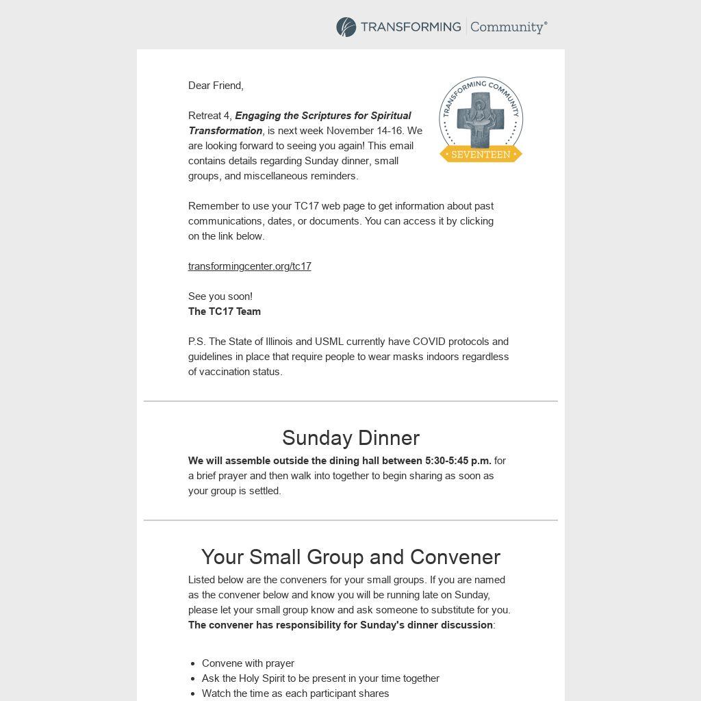 While the dinner hour can't have the same rhythm of silence-and-speaking as your group spiritual direction times, it can still contain the same spirit of allowing each person to share their experience of prayer these past three months and to receive their words with listening reverence. Before arriving, consider locating the picture of your small group and spending some time in prayer for each member.