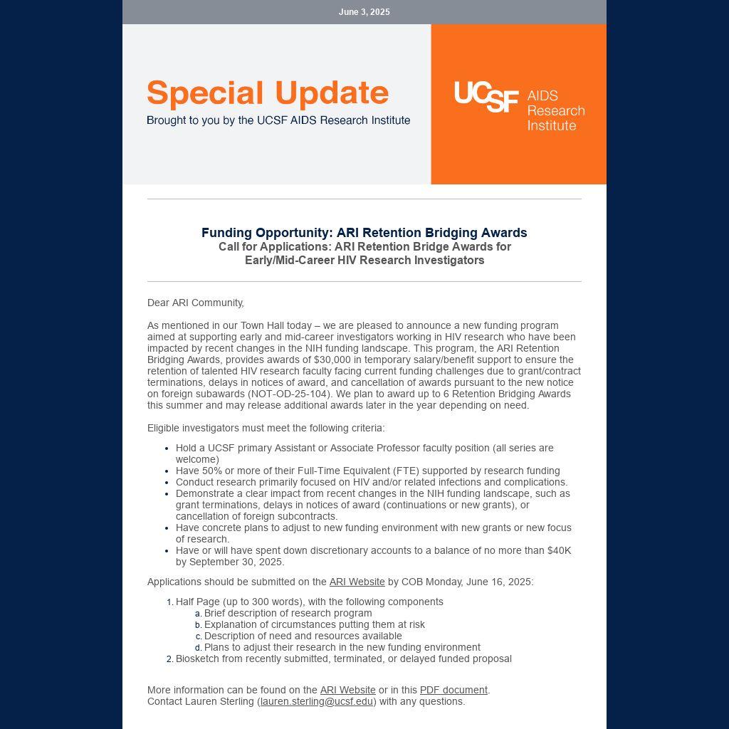 As mentioned in our Town Hall today – we are pleased to announce a new funding program aimed at supporting early and mid-career investigators working in HIV research who have been impacted by recent changes in the NIH funding landscape. This program, the ARI Retention Bridging Awards, provides awards of $30,000 in temporary salary/benefit support to ensure the retention of talented HIV research faculty facing current funding challenges due to grant/contract terminations, delays in notices of award, and cancellation of awards pursuant to the new notice on foreign subawards (NOT-OD-25-104). We plan to award up to 6 Retention Bridging Awards this summer and may release additional awards later in the year depending on need.