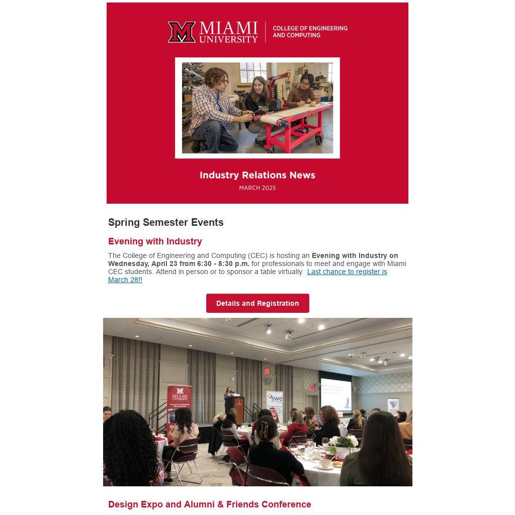 The College of Engineering and Computing (CEC) is hosting an Evening with Industry on Wednesday, April 23 from 6:30 - 8:30 p.m. for professionals to meet and engage with Miami CEC students. Attend in person or to sponsor a table virtually. Last chance to register is March 28!!