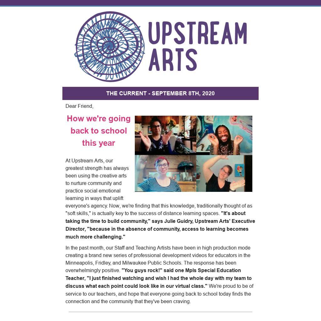 At Upstream Arts, our greatest strength has always been using the creative arts to nurture community and practice social emotional learning in ways that uplift everyone's agency. Now, we're finding that this knowledge, traditionally thought of as "soft skills," is actually key to the success of distance learning spaces. "It's about taking the time to build community," says Julie Guidry, Upstream Arts' Executive Director, "because in the absence of community, access to learning becomes much more challenging."