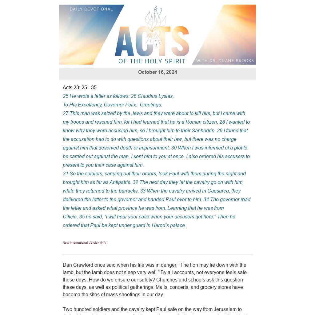 Two hundred soldiers and the cavalry kept Paul safe on the way from Jerusalem to Antipatris and then to Caesarea by the sea. Apparently, Paul’s opponents did not feel that they could overcome a Roman garrison. The commander Claudius Lysias sent Paul to Governor Felix so that his accusers might make their case against him. But the commander kept him safe with soldiers on the journey. Was Paul under arrest or under the protection of the Roman government at this point? In his letter to Felix, the commander seems to say Paul is being kept safe. Instead of a prison, he finds a palace for his accommodations in Caesarea. Is Paul safe there?