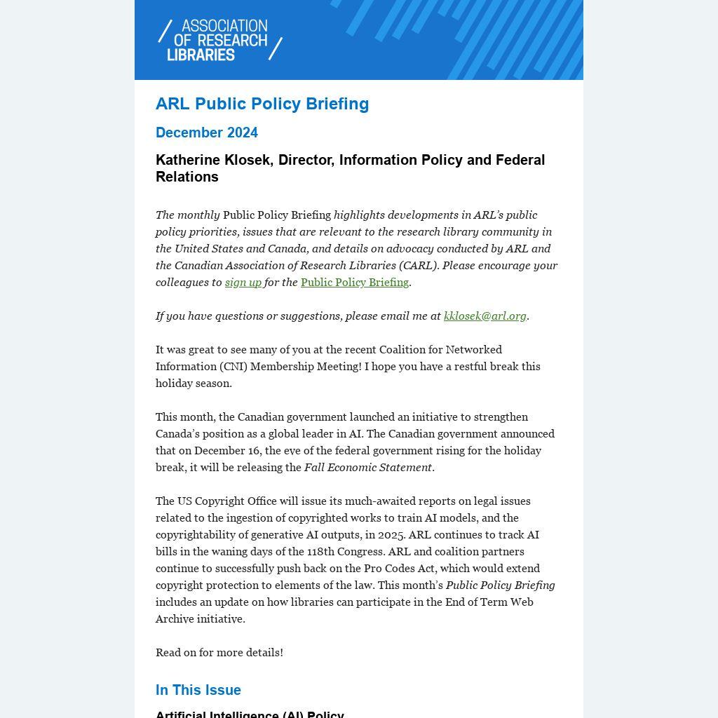 The monthly Public Policy Briefing highlights developments in ARL’s public policy priorities, issues that are relevant to the research library community in the United States and Canada, and details on advocacy conducted by ARL and the Canadian Association of Research Libraries (CARL). Please encourage your colleagues to sign up for the Public Policy Briefing.