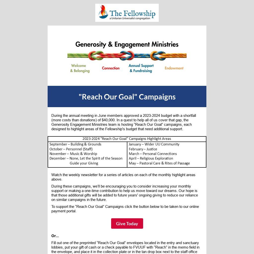 Fill out one of the preprinted “Reach Our Goal” envelopes located in the entry and sanctuary lobbies, put your gift of cash or a check payable to FVUUF with “Reach” in the memo field in the envelope, and place it in the collection plate or in the tan drop box next to the staff office wing door.