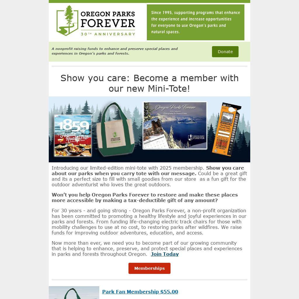 Introducing our limited-edition mini-tote with 2025 membership. Show you care about our parks when you carry tote with our message. Could be a great gift and its a perfect size to fill with small goodies from our store as a fun gift for the outdoor adventurist who loves the great outdoors.