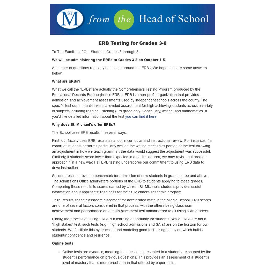 Finally, the process of taking ERBs is a learning opportunity for students. While ERBs are not a "high stakes" test, such tests (e.g., high school admissions and SATs) are on the horizon for our students. We facilitate this by teaching and modeling good test-taking behavior, which builds students' confidence and resilience.