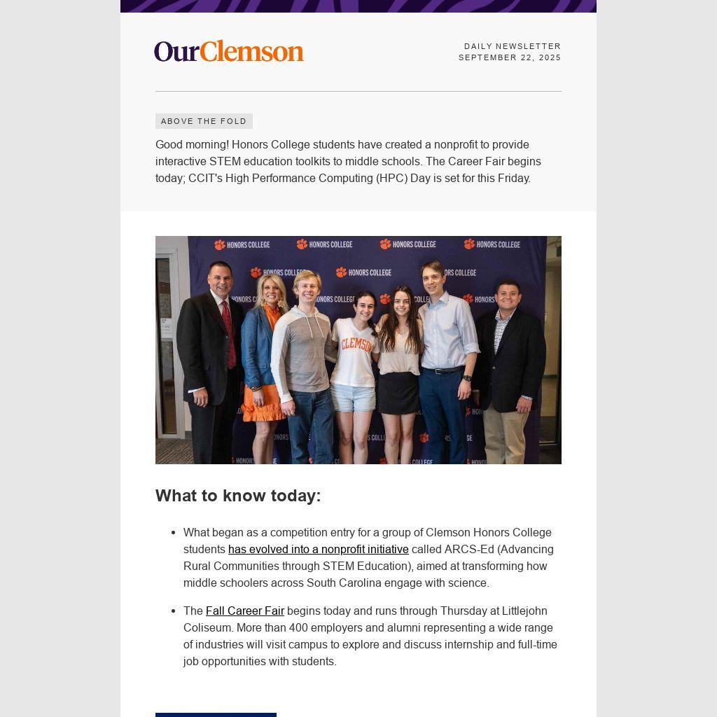 Good morning! Honors College students have created a nonprofit to provide interactive STEM education toolkits to middle schools. The Career Fair begins today; CCIT's High Performance Computing (HPC) Day is set for this Friday.