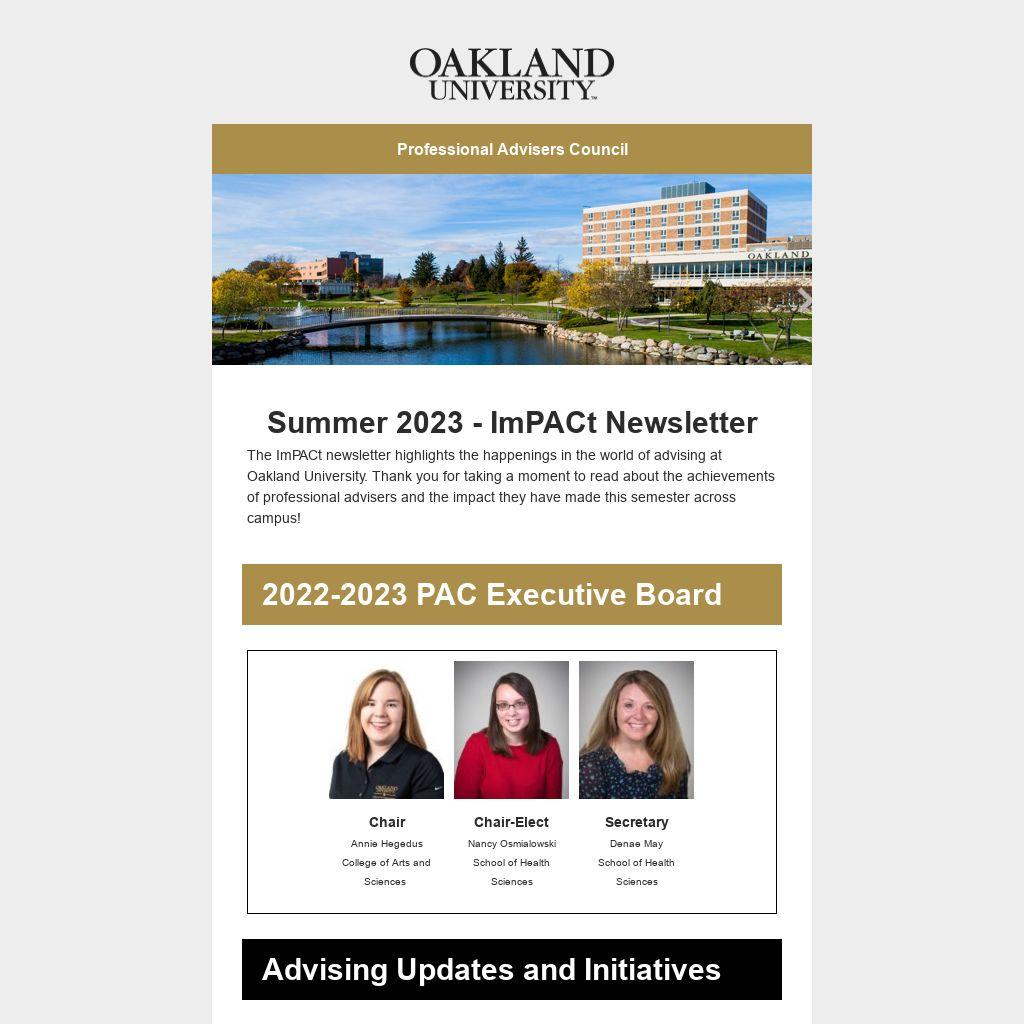 The ImPACt newsletter highlights the happenings in the world of advising at Oakland University. Thank you for taking a moment to read about the achievements of professional advisers and the impact they have made this semester across campus!
