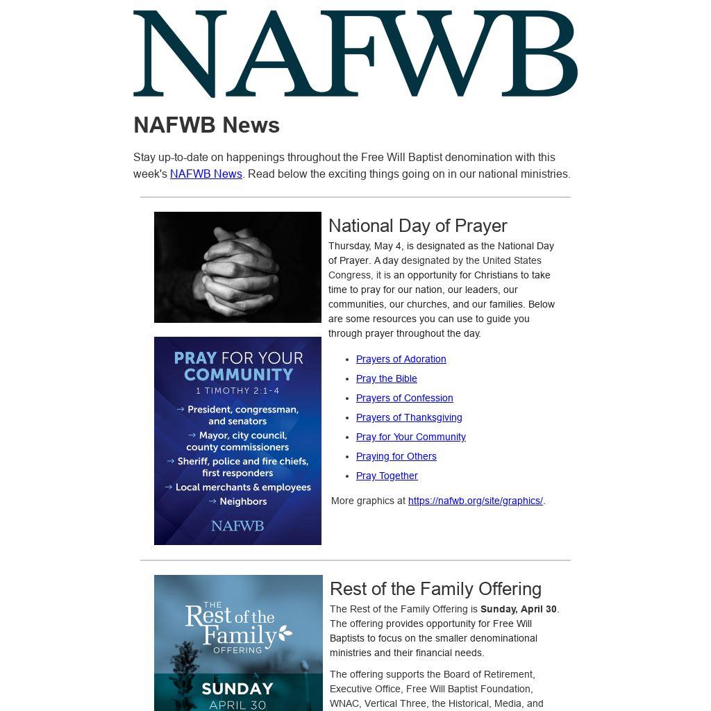 The Rest of the Family Offering is Sunday, April 30. The offering provides opportunity for Free Will Baptists to focus on the smaller denominational ministries and their financial needs.