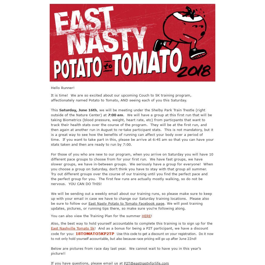 We will be sending out a weekly email about our training runs, so please make sure to keep up with your email in case we have to change our Saturday training locations. Please also be sure to follow our East Nasty Potato to Tomato Facebook page. We will post training updates, pictures, or running tips there, so make sure you're following along. You can also view the Training Plan for the summer HERE!