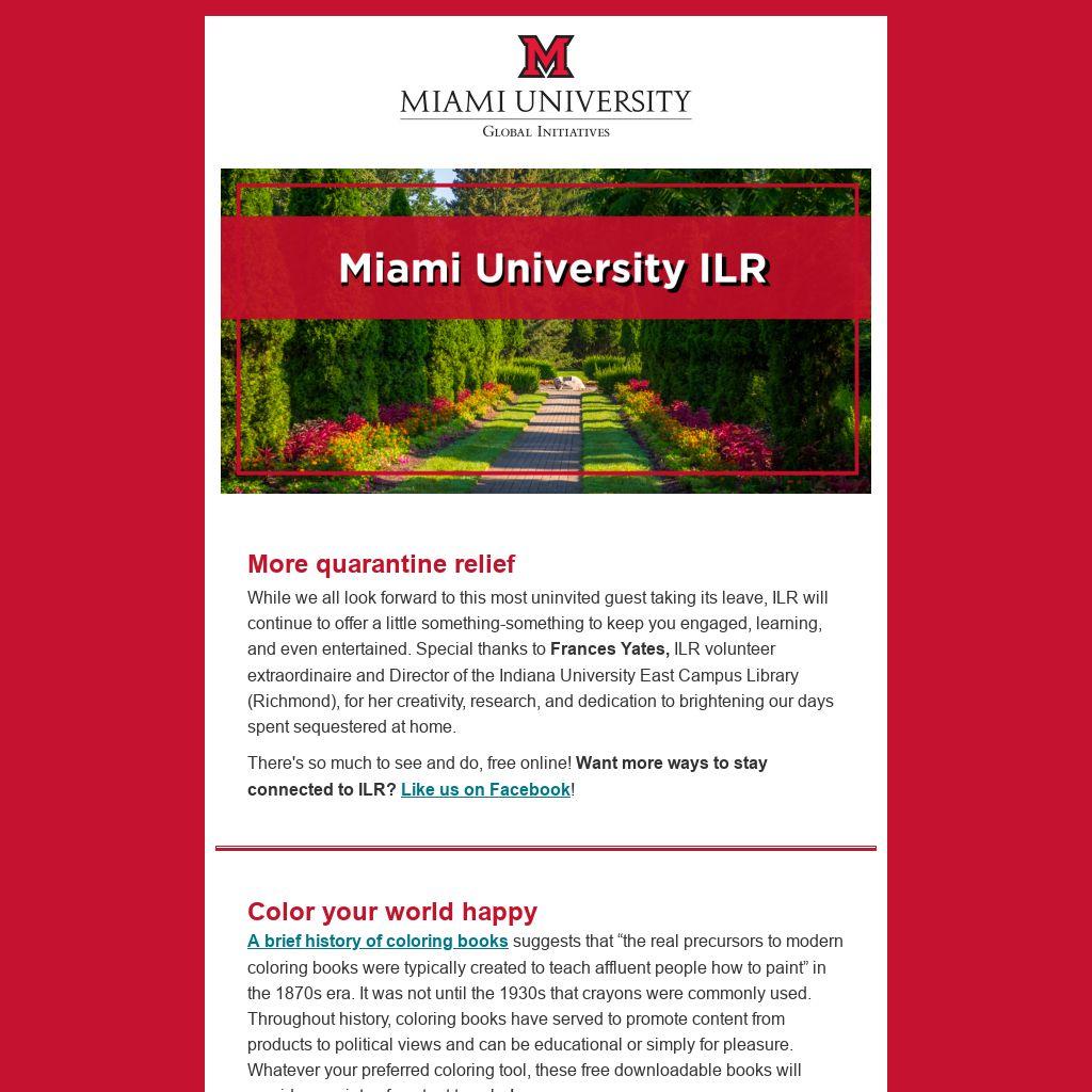 More quarantine reliefWhile we all look forward to this most uninvited guest taking its leave, ILR will continue to offer a little something-something to keep you engaged, learning, and even entertained. Special thanks to Frances Yates, ILR volunteer extraordinaire and Director of the Indiana University East Campus Library (Richmond), for her creativity, research, and dedication to brightening our days spent sequestered at home.