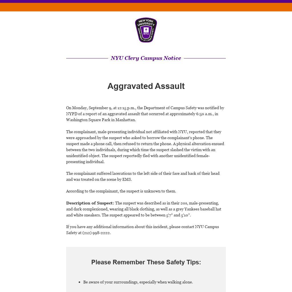 On Monday, September 9, at 12:15 p.m., the Department of Campus Safety was notified by NYPD of a report of an aggravated assault that occurred at approximately 6:50 a.m., in Washington Square Park in Manhattan.