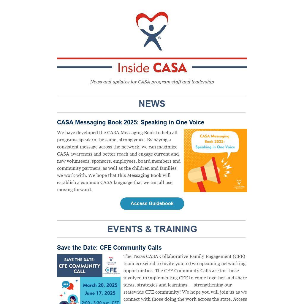 The Texas CASA Collaborative Family Engagement (CFE) team is excited to invite you to two upcoming networking opportunities. The CFE Community Calls are for those involved in implementing CFE to come together and share ideas, strategies and learnings — strengthening our statewide CFE community! We hope you will join us as we connect with those doing the work across the state. Access the Zoom link below and mark your calendars for the next two calls.