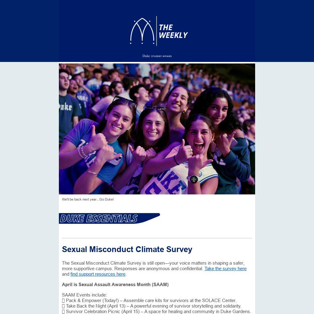 The Sexual Misconduct Climate Survey is still open—your voice matters in shaping a safer, more supportive campus. Responses are anonymous and confidential. Take the survey here and find support resources here.