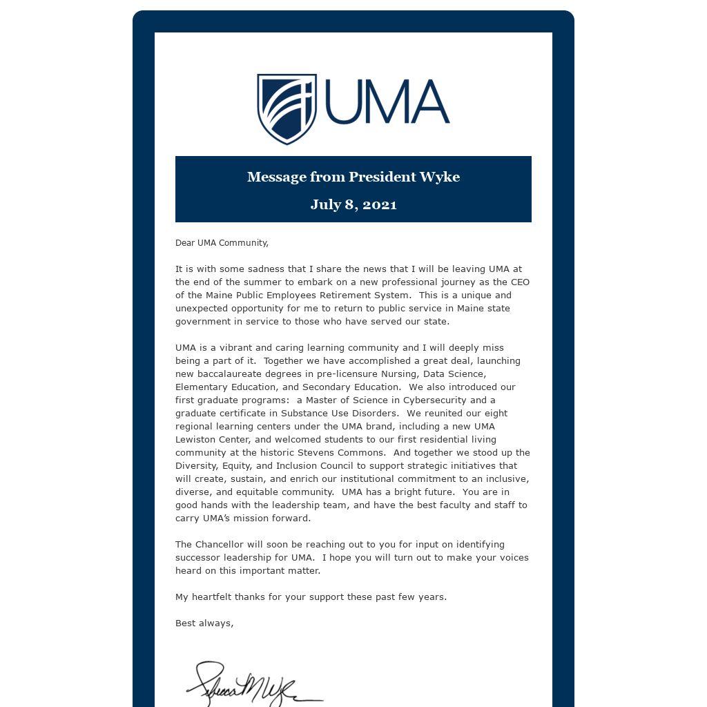 It is with some sadness that I share the news that I will be leaving UMA at the end of the summer to embark on a new professional journey as the CEO of the Maine Public Employees Retirement System. This is a unique and unexpected opportunity for me to return to public service in Maine state government in service to those who have served our state.
