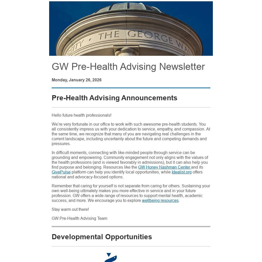 Remember that caring for yourself is not separate from caring for others. Sustaining your own well-being ultimately makes you more effective in service and in your future profession. GW offers a wide range of resources to support mental health, academic success, and more. We encourage you to explore wellbeing resources.
