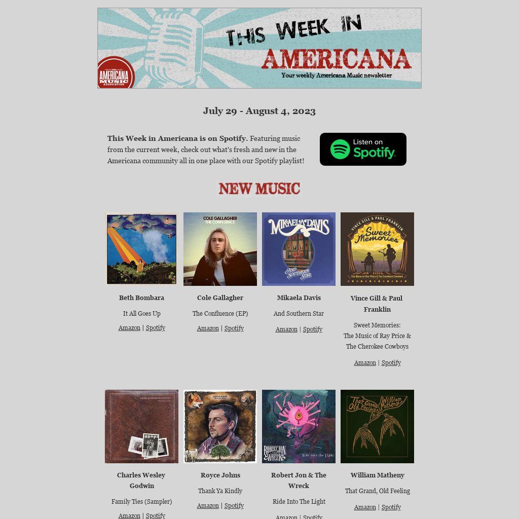 This Week in Americana is on Spotify. Featuring music from the current week, check out what's fresh and new in the Americana community all in one place with our Spotify playlist!