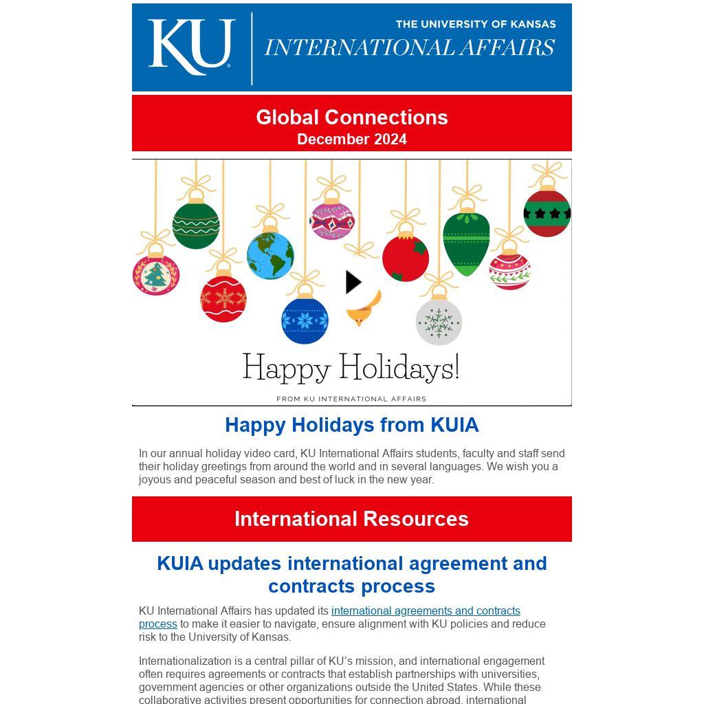 In our annual holiday video card, KU International Affairs students, faculty and staff send their holiday greetings from around the world and in several languages. We wish you a joyous and peaceful season and best of luck in the new year.