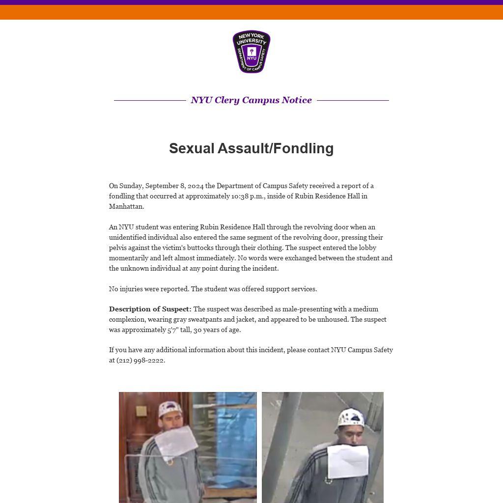 On Sunday, September 8, 2024 the Department of Campus Safety received a report of a fondling that occurred at approximately 10:38 p.m., inside of Rubin Residence Hall in Manhattan.