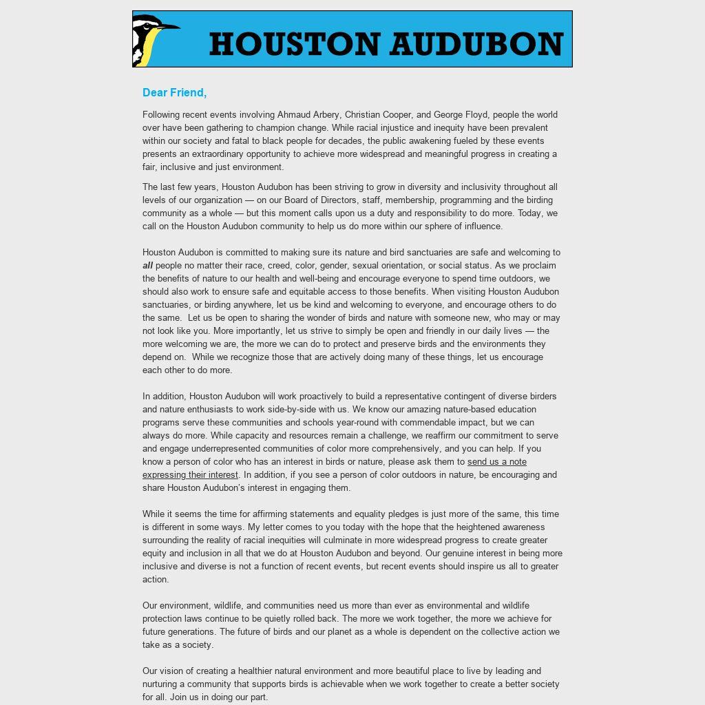 While it seems the time for affirming statements and equality pledges is just more of the same, this time is different in some ways. My letter comes to you today with the hope that the heightened awareness surrounding the reality of racial inequities will culminate in more widespread progress to create greater equity and inclusion in all that we do at Houston Audubon and beyond. Our genuine interest in being more inclusive and diverse is not a function of recent events, but recent events should inspire us all to greater action.