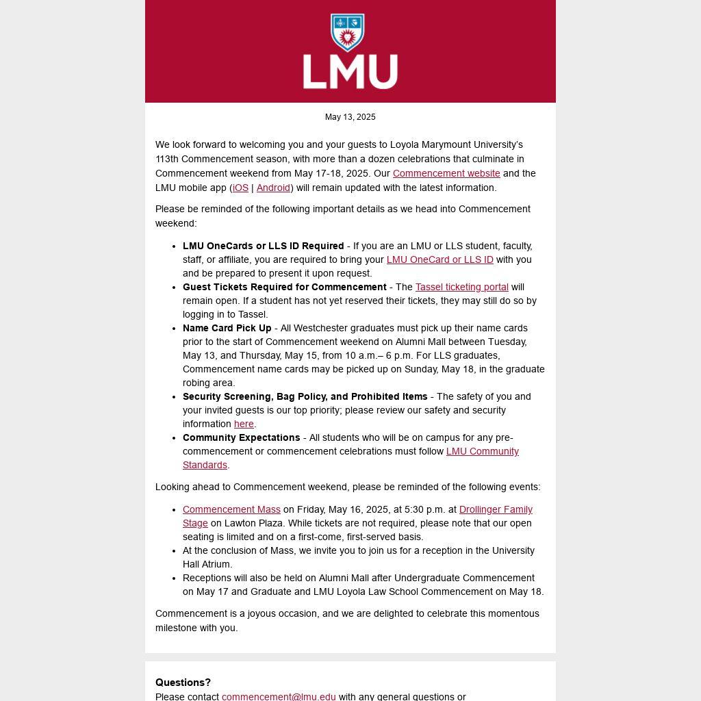 Notice of Filming and Photography: When you attend an LMU event, you enter an area where photography, audio, and video recording may occur. By entering the event premises, you consent to such recording media and its release, publication, exhibition, or reproduction in any medium or format whatsoever now existing or hereafter created. As an attendee, you release all legal and equitable rights relating to copyright infringement, infringement of moral rights, libel, defamation, invasion of any rights of privacy, violation of rights of publicity, physical or emotional injury or distress, or any similar claim or cause of action pertaining to your name, image, and likeness.