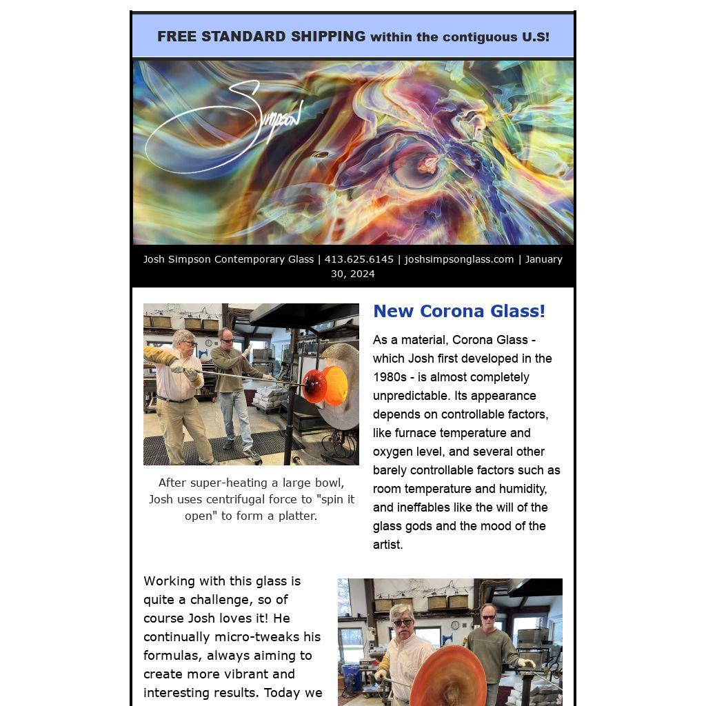 Working with this glass is quite a challenge, so of course Josh loves it! He continually micro-tweaks his formulas, always aiming to create more vibrant and interesting results. Today we feature a new collection of Corona platters and vases that are especially dramatic.