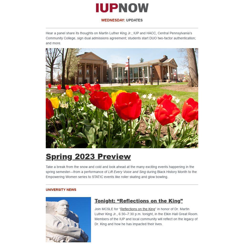 Distributed to IUP employees and students twice a week, IUP Now is the official newsletter of Indiana University of Pennsylvania. It features news from across the IUP website, compiled by the Division of Marketing and Communications. Find out how to get your news and events in IUP Now.
