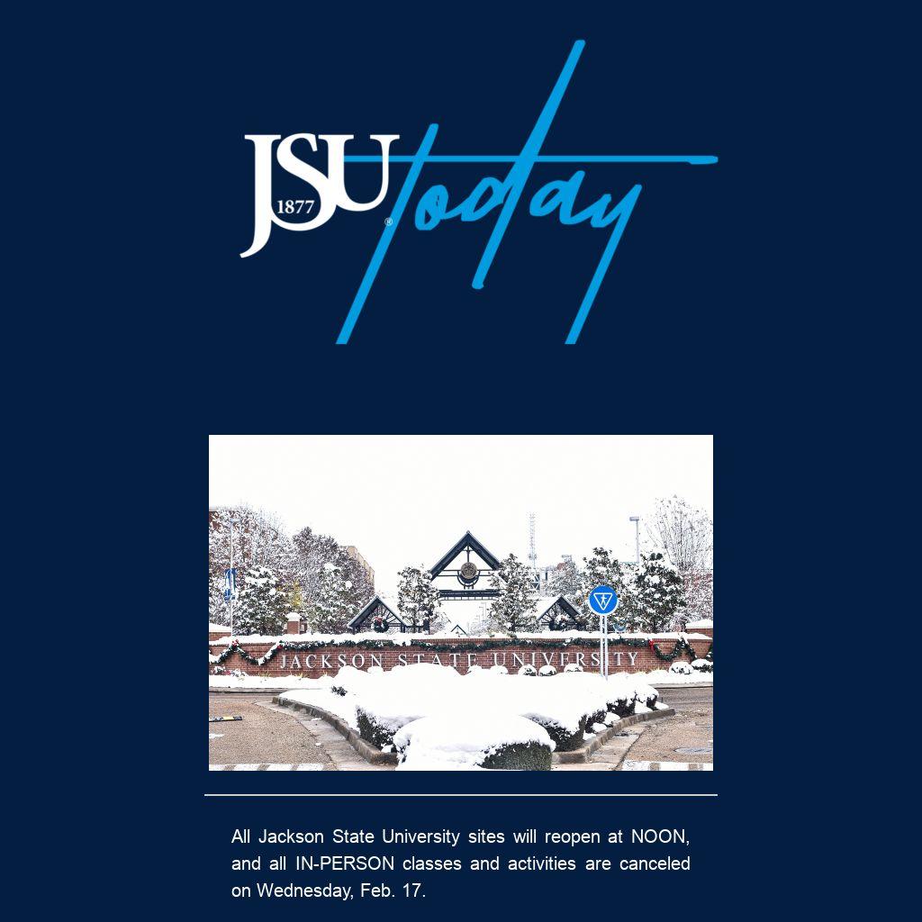All Jackson State University sites will reopen at NOON, and all IN-PERSON classes and activities are canceled on Wednesday, Feb. 17.
