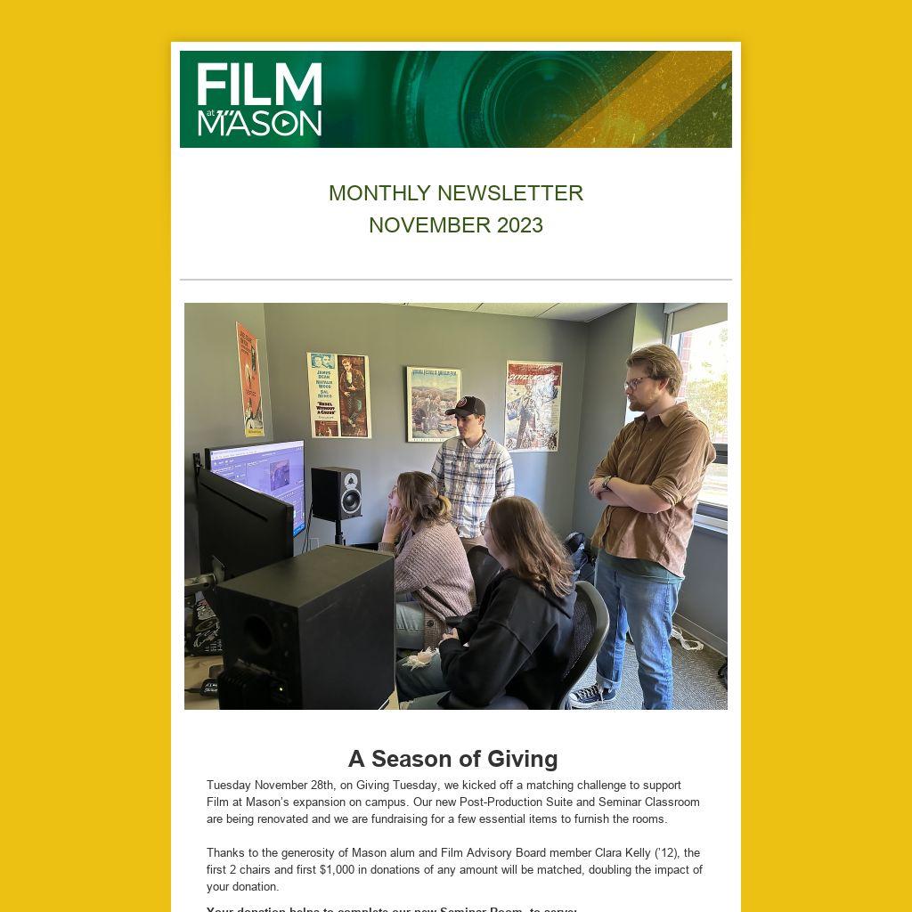 Tuesday November 28th, on Giving Tuesday, we kicked off a matching challenge to support Film at Mason’s expansion on campus. Our new Post-Production Suite and Seminar Classroom are being renovated and we are fundraising for a few essential items to furnish the rooms.