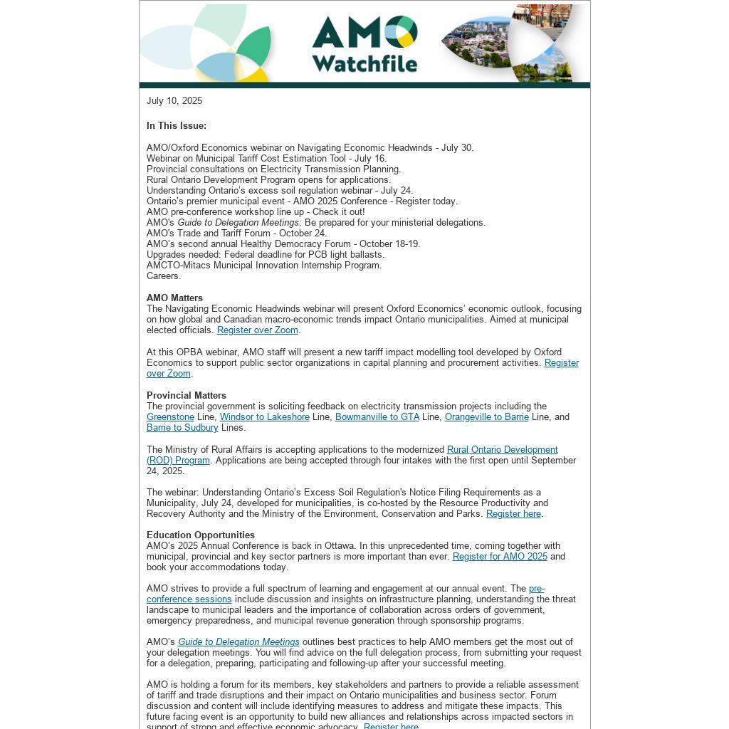 AMO is holding a forum for its members, key stakeholders and partners to provide a reliable assessment of tariff and trade disruptions and their impact on Ontario municipalities and business sector. Forum discussion and content will include identifying measures to address and mitigate these impacts. This future facing event is an opportunity to build new alliances and relationships across impacted sectors in support of strong and effective economic advocacy. Register here.