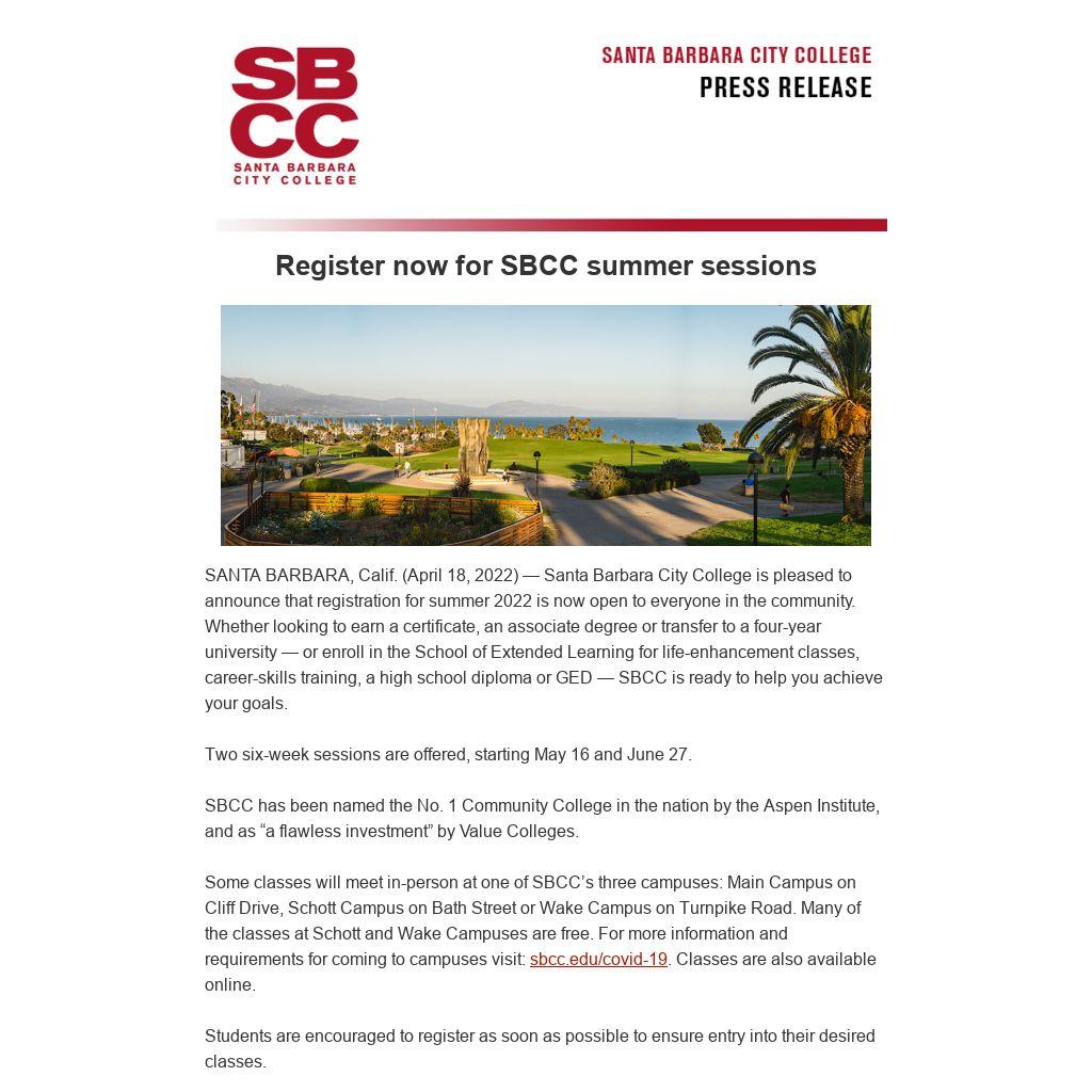 SANTA BARBARA, Calif. (April 18, 2022) — Santa Barbara City College is pleased to announce that registration for summer 2022 is now open to everyone in the community. Whether looking to earn a certificate, an associate degree or transfer to a four-year university — or enroll in the School of Extended Learning for life-enhancement classes, career-skills training, a high school diploma or GED — SBCC is ready to help you achieve your goals.