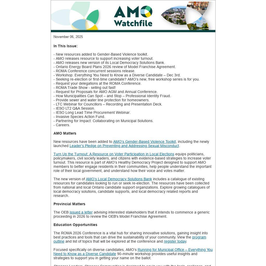 Join AMO and the Future Cities Institute on November 19th at 12:00pm for an interactive session exploring how municipal and post-secondary partnerships can tackle today’s most complex local challenges. Learn practical ways municipal leaders, planners, and researchers can collaborate with academic institutions to drive innovation and change. Register here.