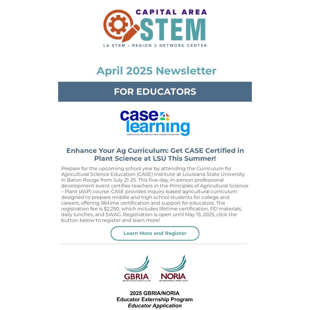 Prepare for the upcoming school year by attending the Curriculum for Agricultural Science Education (CASE) Institute at Louisiana State University in Baton Rouge from July 21-25. This five-day, in-person professional development event certifies teachers in the Principles of Agricultural Science – Plant (ASP) course. CASE provides inquiry-based agricultural curriculum designed to prepare middle and high school students for college and careers, offering lifetime certification and support for educators. The registration fee is $2,250, which includes lifetime certification, PD materials, daily lunches, and SWAG. Registration is open until May 15, 2025, click the button below to register and learn more!