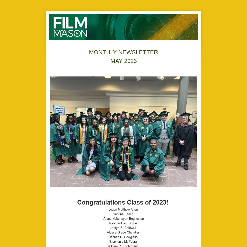 We want to hear from you! If you have news you would like to contribute, please send it to film@gmu.edu. We are looking for regional film events and updates from Film at Mason alumni. Keep up-to-date on all the current Film at Mason news at film.gmu.edu.