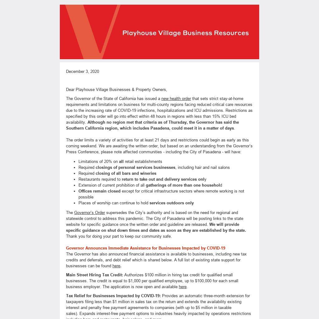 The Governor of the State of California has issued a new health order that sets strict stay-at-home requirements and limitations on business for multi-county regions facing reduced critical care resources due to the increasing rate of COVID-19 infections, hospitalizations and ICU admissions. Restrictions as specified by this order will go into effect within 48 hours in regions with less than 15% ICU bed availability. Although no region met that criteria as of Thursday, the Governor has said the Southern California region, which includes Pasadena, could meet it in a matter of days.